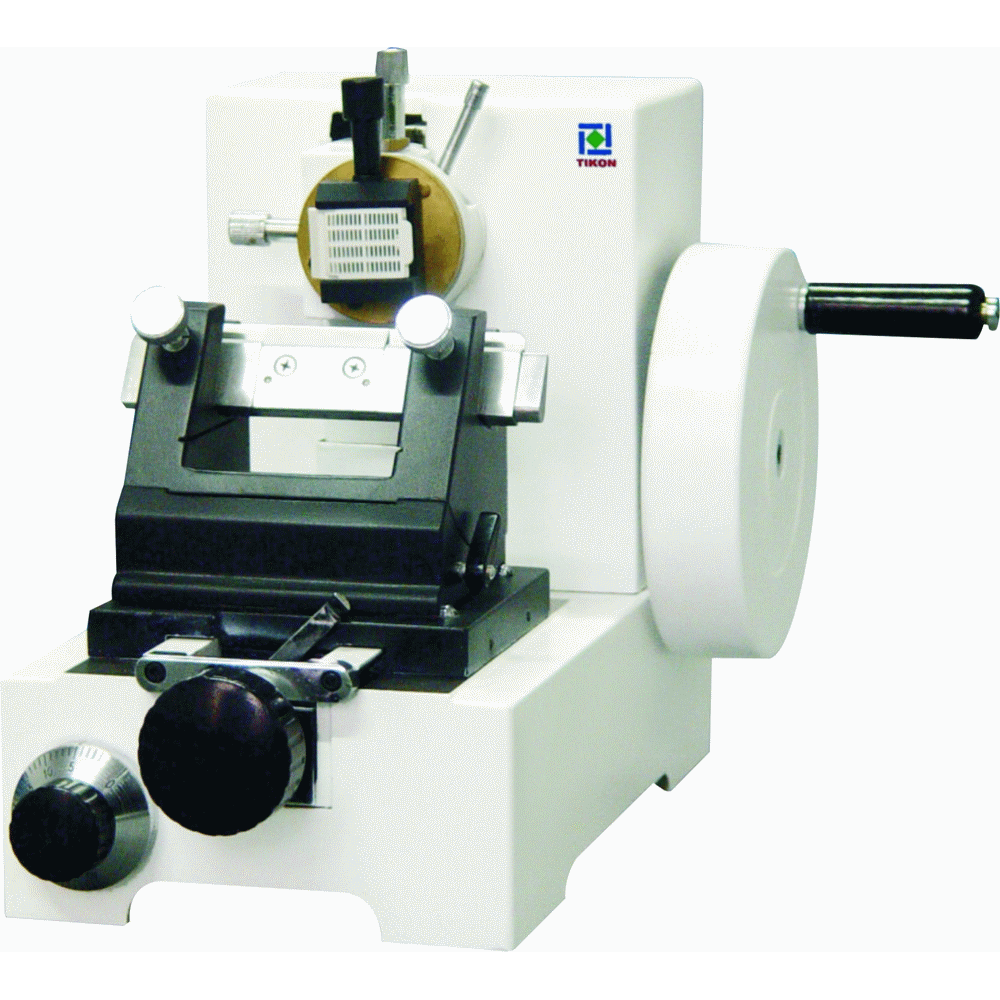 切片機(jī)是切制薄而均勻組織片的機(jī)械,每切一次借切片厚度器自動(dòng)向前(向刀的方向)推進(jìn)所需距離,厚度器的梯度通常為1微米。切制石蠟包埋的組織時(shí),由于與前一張切片的蠟邊粘著,而制成多張切片的切片條。